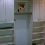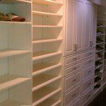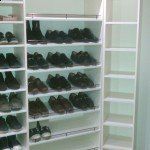 Clever Closets just completed a closet installation, satisfying our customer's need for shoes towers. We tipped the shelves in one of the towers and used shoe fences to showcase the shoes. He also wanted the option to switch one of the shelving towers into hanging (at a later date) so we cut two poles to fit where the shelving is. Greg designed the closet so the hanging is across the entire back wall and towers flank the left side. This creates an open feeling in the room. No clothes should ever hang in your face. This also made the narrow part of the closet wider because hanging takes up 24 inches and shelving is only 14 inches deep.